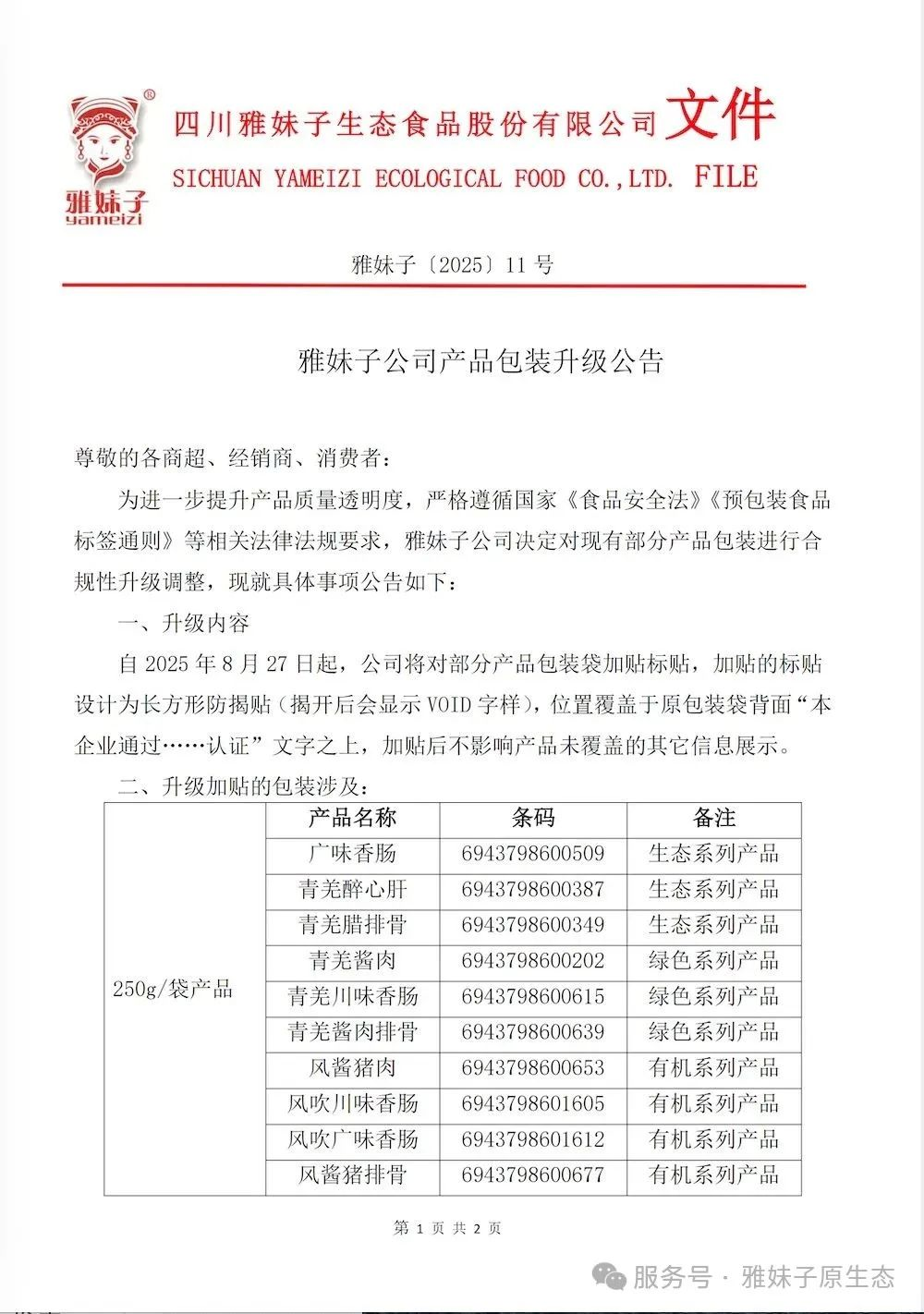 尊敬的各商超、经销商、消费者: 因产品工艺升级调整,公司生产的“腊肉”(条码号: ...