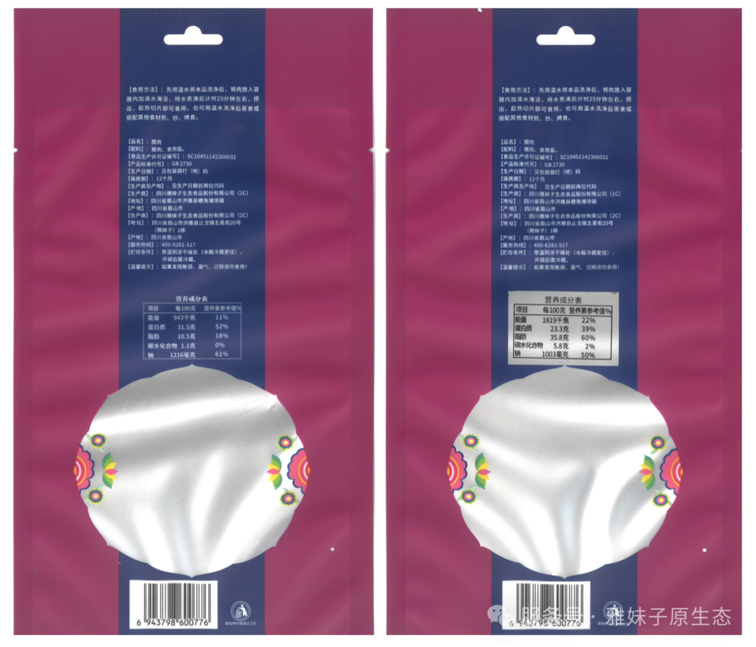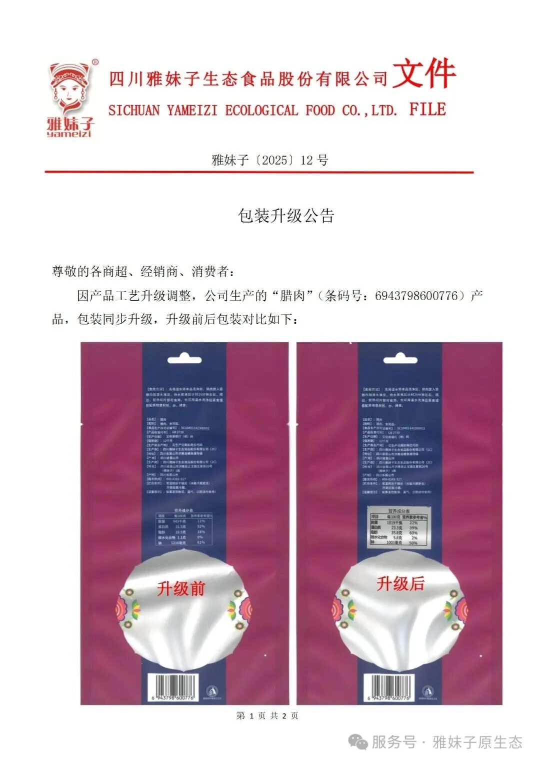 因产品工艺升级调整,公司生产的“腊肉”(条码号:6943798600776)产品,包装同步升级,升级前后包装对比如下: